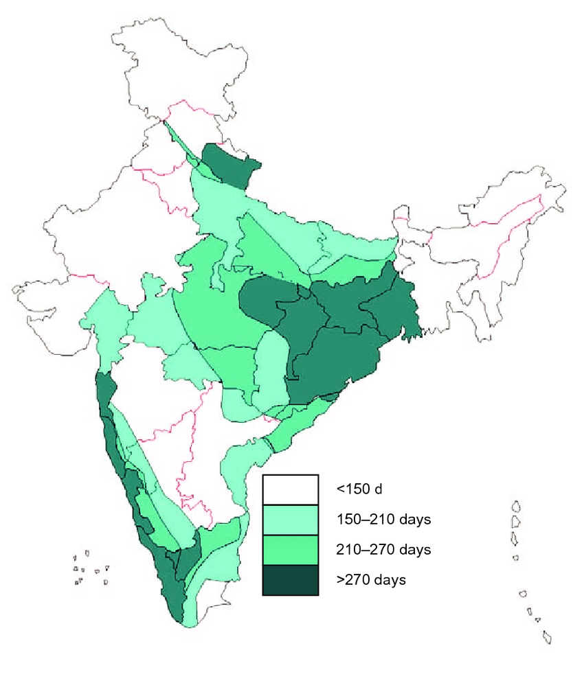 Wet regions of India where algal cultivation is technically feasible measured in terms of adequate availability/supply of water after meeting the needs of a single or double crop. This is determined as a function of the period for which the cumulative open pan evaporation (OPE) is less than the total annual precipitation measured in days.